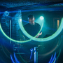 různé barvy z ledkových trubic a reflektorů na stropě přesně podle hudby a